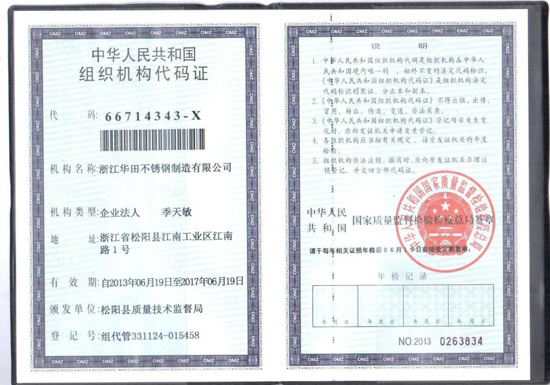 | 企业名称 | 浙江华田不锈钢制造有限公司 | 企业信用代码 | 9133112466714343X5 |